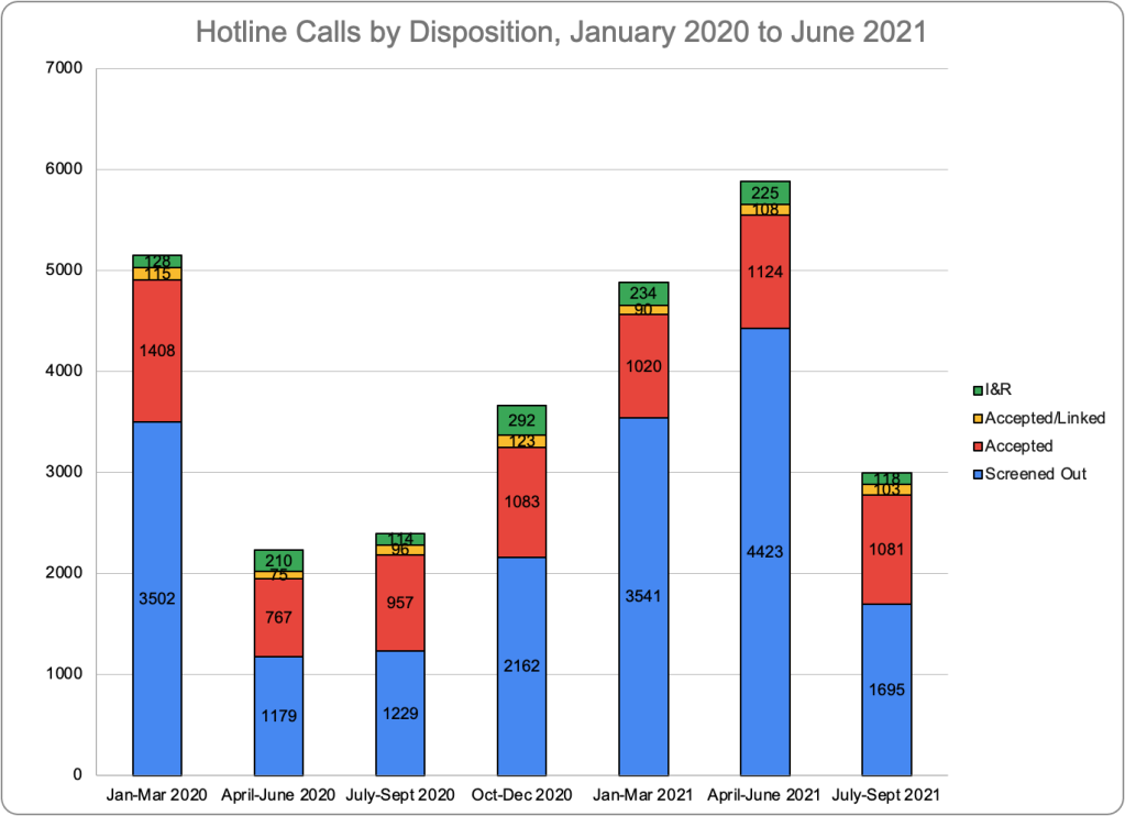*While the number of referrals accepted for investigation was 3,902 in FY2023 according to the Dashboard’s Hotline Calls by Referral Type graphic, the total number of investigations displayed in the Investigations by Disposition graphic was 3,704. The reason for the difference is unclear. According to the Dashboard, “accepted for investigation” means that “the hotline call resulted in a new investigation being opened on the family.” So the two numbers should be the same.