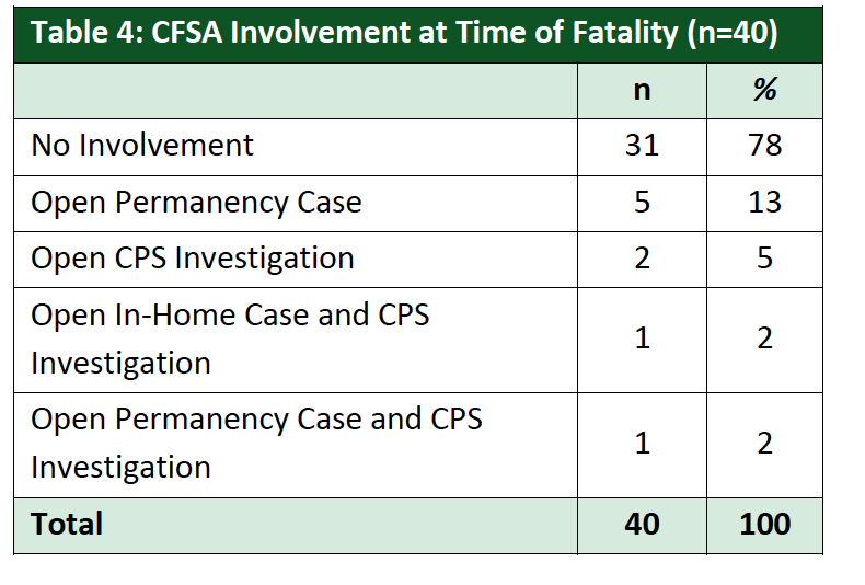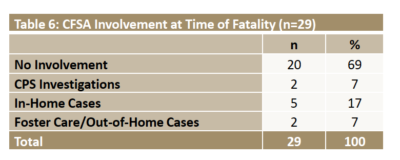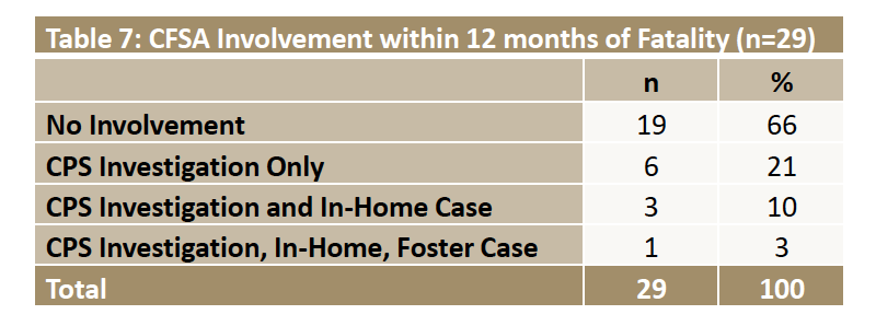 Nine of the 40 families reviewed in the report (or about 23 percent) were involved with CFSA at the time of the fatality. Of these nine families, five had an open foster care case, two had an open investigation, one had an open in-home case and an open investigation, and one had an open permanency case and an open CPS investigation. Obviously it is concerning that these fatalities could occur while CFSA was actively involved with the family. One has to wonder whether any red flags were disregarded. But without knowing the details of CFSA’s involvement with these families, it is impossible for readers of this report to make any conclusions about agency practice.
