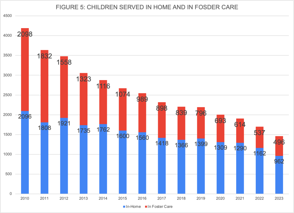 Table 1 shows the number of substantiated investigations, in-home cases opened, and foster cases opened between FY 2019 and FY 2023. The table shows that the number of substantiated investigations has been falling since 2020. In-home case openings fell moderately from FY2020 to FY2022 and dramatically from 463 in FY2022 to 363 in FY2023, a drop of 21.6 percent. Foster care entries, which had fallen rapidly between FY2019 and FY2022, fell less dramatically in FY2023, perhaps beginning a leveling trend after years of rapid decline. The total of in-home cases opened plus foster care entries (in other words, the total number of cases opened) fell from 886 in FY2019 to 542 in FY2023, a drop of 38.8 percent. From FY2022 to FY2023, total cases opened dropped by 18.4 percent. The number of In-home and foster care cases opened as a percent of substantiated investigations over the five-year period has dropped considerably since 2019, from 88.2 percent in FY2019 to 67.8 percent in FY2023, indicating a reduced likelihood of opening a case when an allegation has been substantiated.