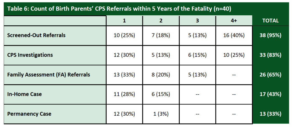 Nine of the 40 families reviewed in the report (or about 23 percent) were involved with CFSA at the time of the fatality. Of these nine families, five had an open foster care case, two had an open investigation, one had an open in-home case and an open investigation, and one had an open permanency case and an open CPS investigation. Obviously it is concerning that these fatalities could occur while CFSA was actively involved with the family. One has to wonder whether any red flags were disregarded. But without knowing the details of CFSA’s involvement with these families, it is impossible for readers of this report to make any conclusions about agency practice.