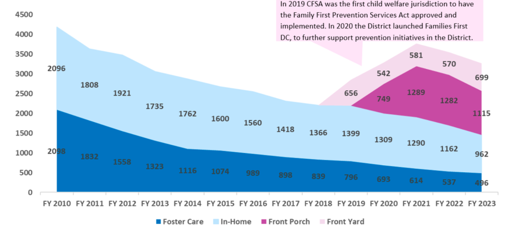 **** It appears that those with an open CFSA case qualify as Front Porch families if they are receiving collaborative services as well as in-home services from CFSA, but this is confusing and suggests the agency may be double-counting families by counting them in both the “in-home” and “front porch” populations. The agency cites a different definition of Front Porch families in its 2023 Annual Public Report, saying that the term refers to “families that have already been the subject of a CPS investigation but did not present with safety or risk levels that warranted opening a child welfare case.